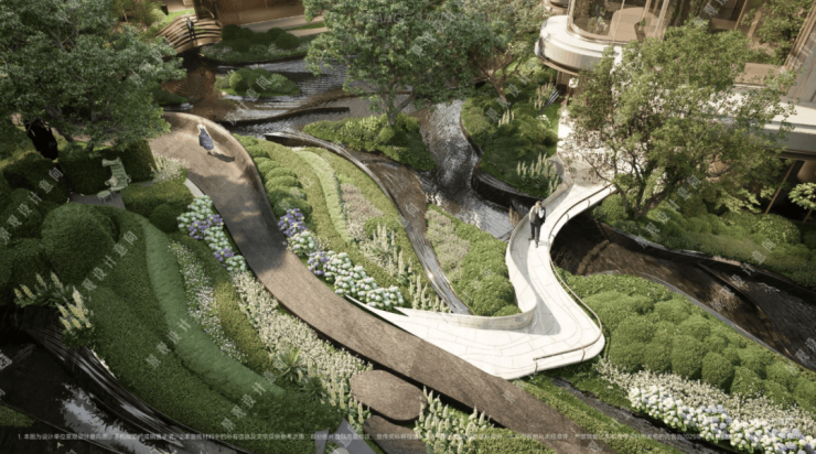 在全域抬板约4米的基础上,项目又下挖,形成罕见垂直落差。依托这一独特地形,项目打造“沿街古树花园+板上浮空花园+板下流石花园”的多层立体景观体系。